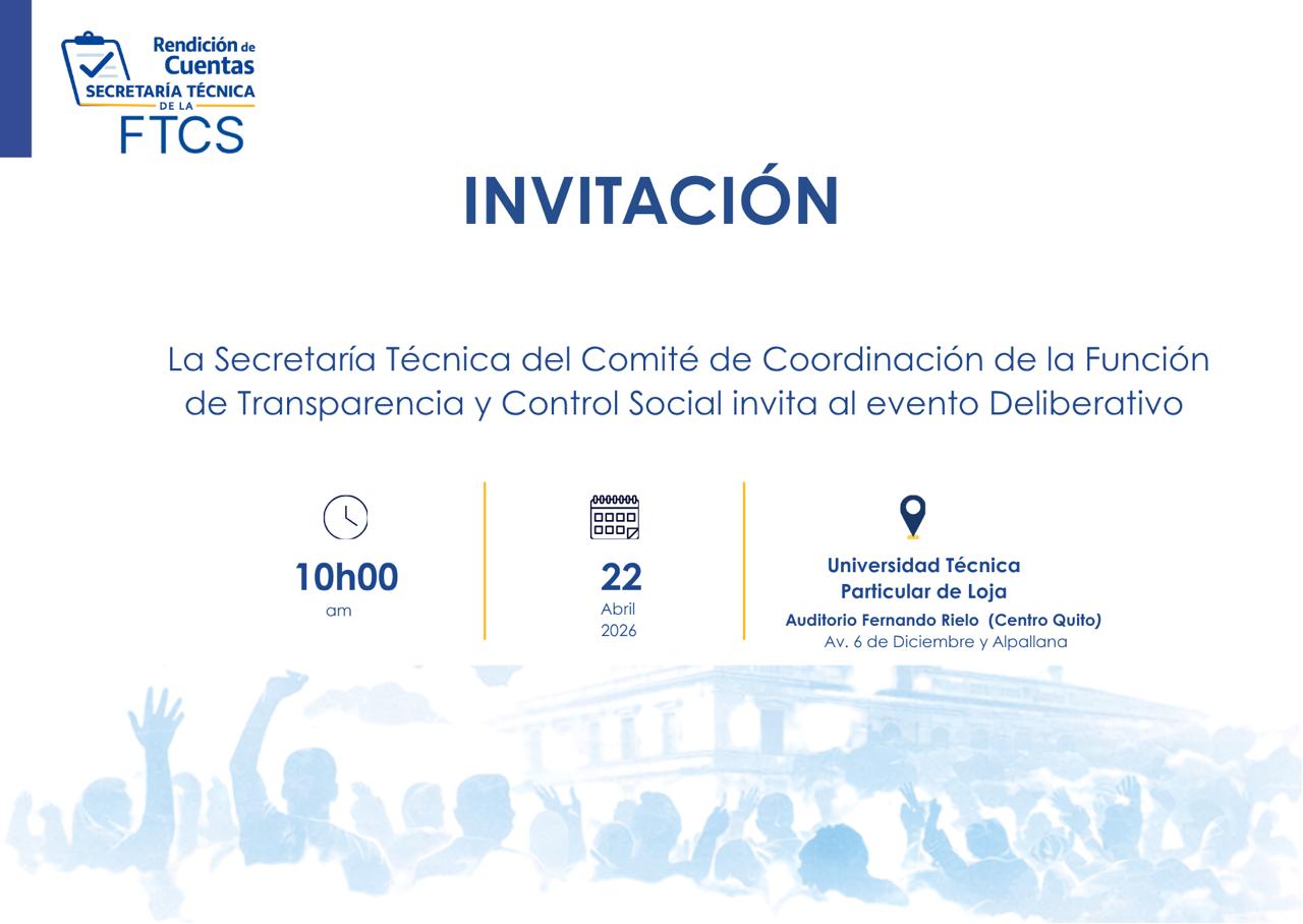 La Secretaría Técnica del Comité de Coordinación de la Función de Transparencia y Control Social invita a la ciudadanía, autoridades, academia y actores sociales a participar en la Deliberación Pública de Rendición de Cuentas 2025, en cumplimiento de los principios de transparencia, participación ciudadana y gestión pública abierta.